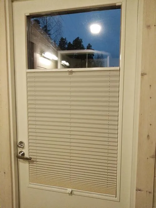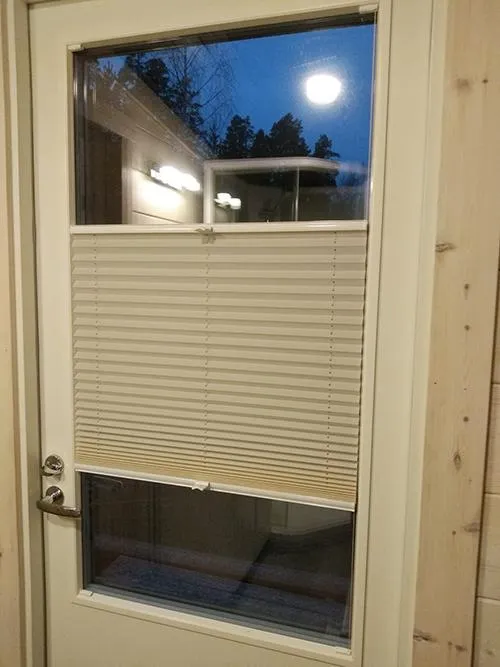 Valkoinen vekkiverho ikkunassa ja ovessa